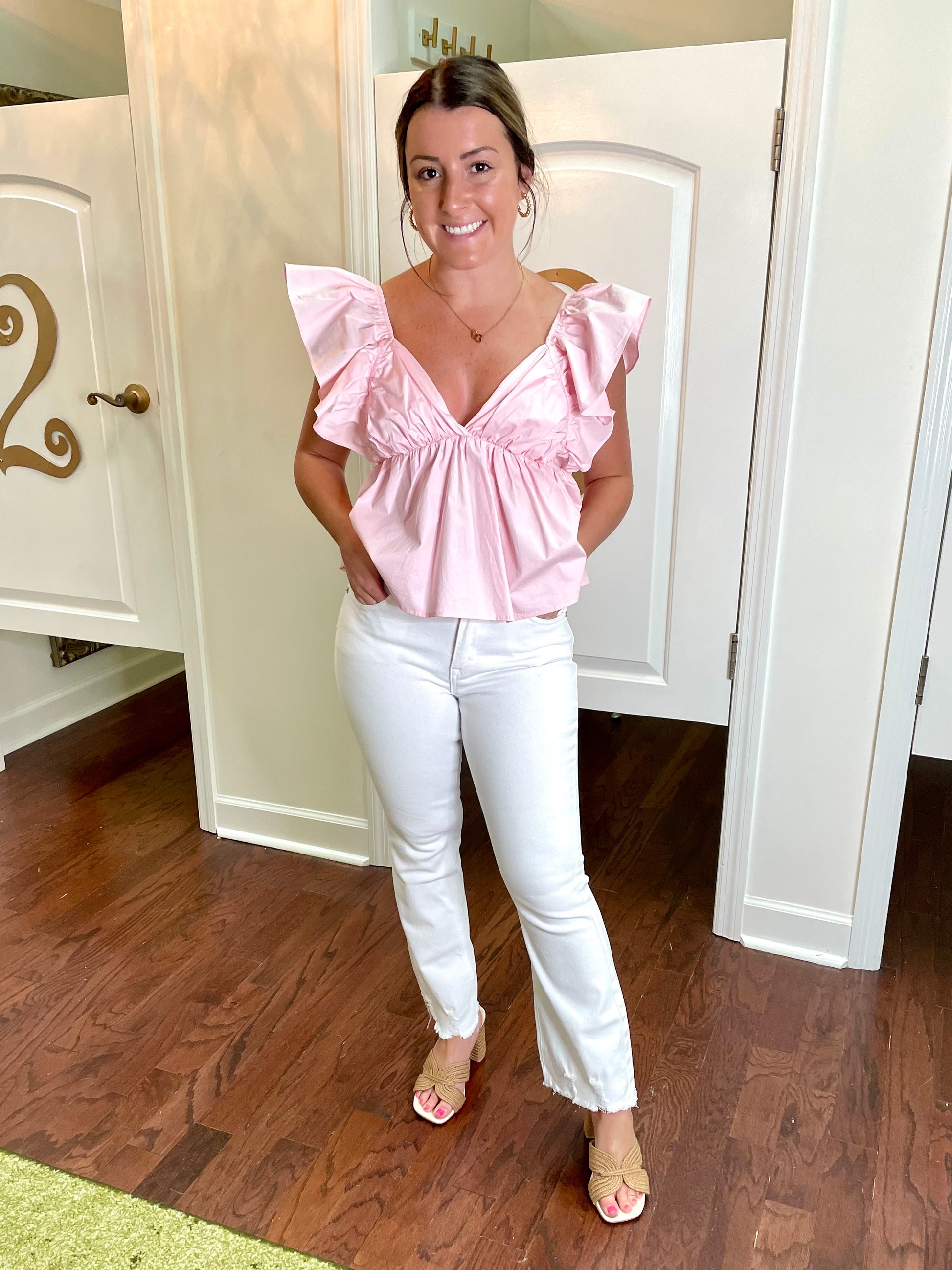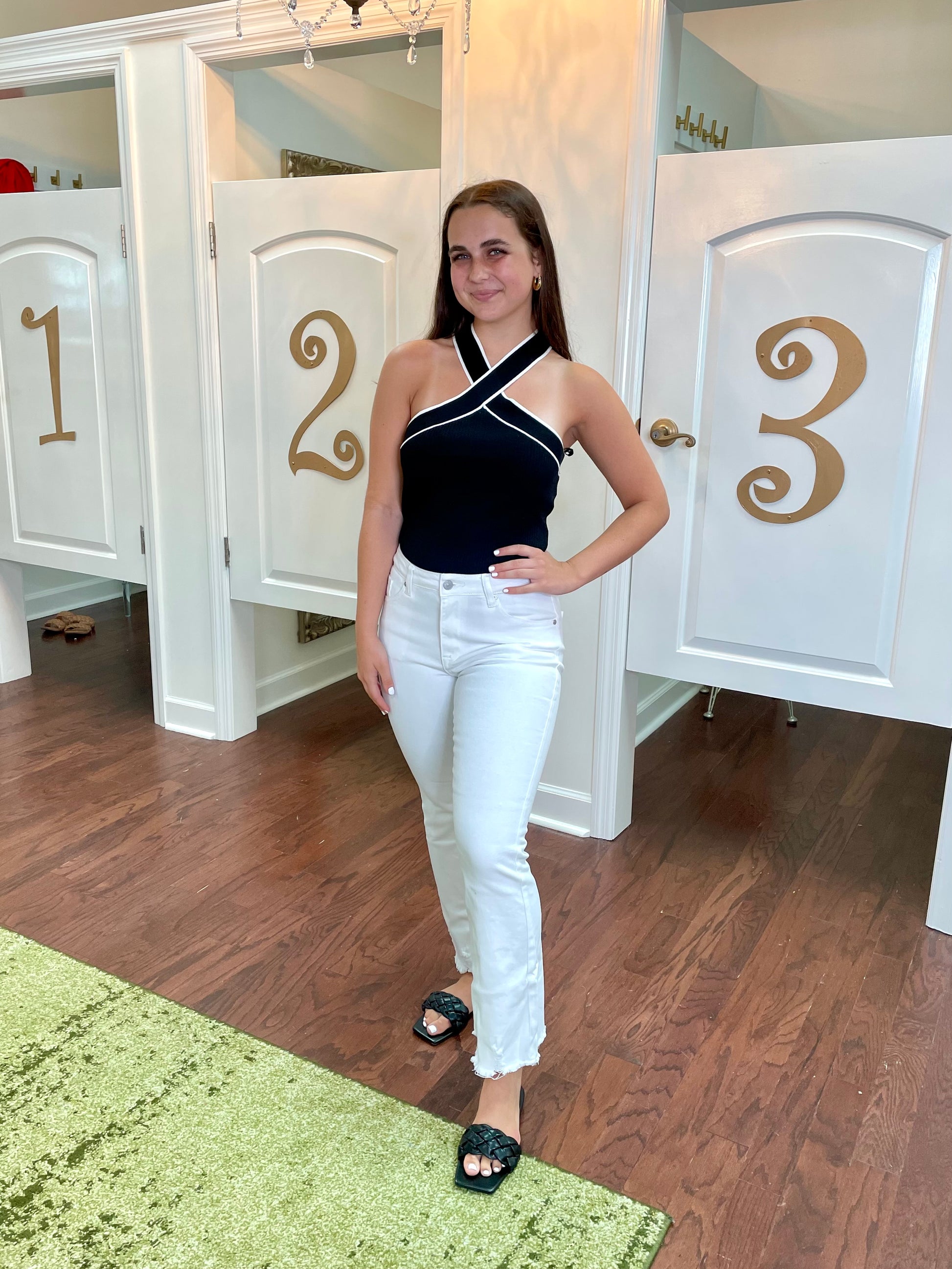 Step up your denim game with our Volumina Jeans. The trendy high rise waist and cropped length create a flattering silhouette while the stretch fabric ensures maximum comfort. The released hem adds a touch of edge to these 5 pocket jeans. Zipper fly and single button closure for convenience. White wash - 97% cotton, 3% spandex. Medium Wash - 75% Cotton, 23% Tencel, and 2% Spandex.