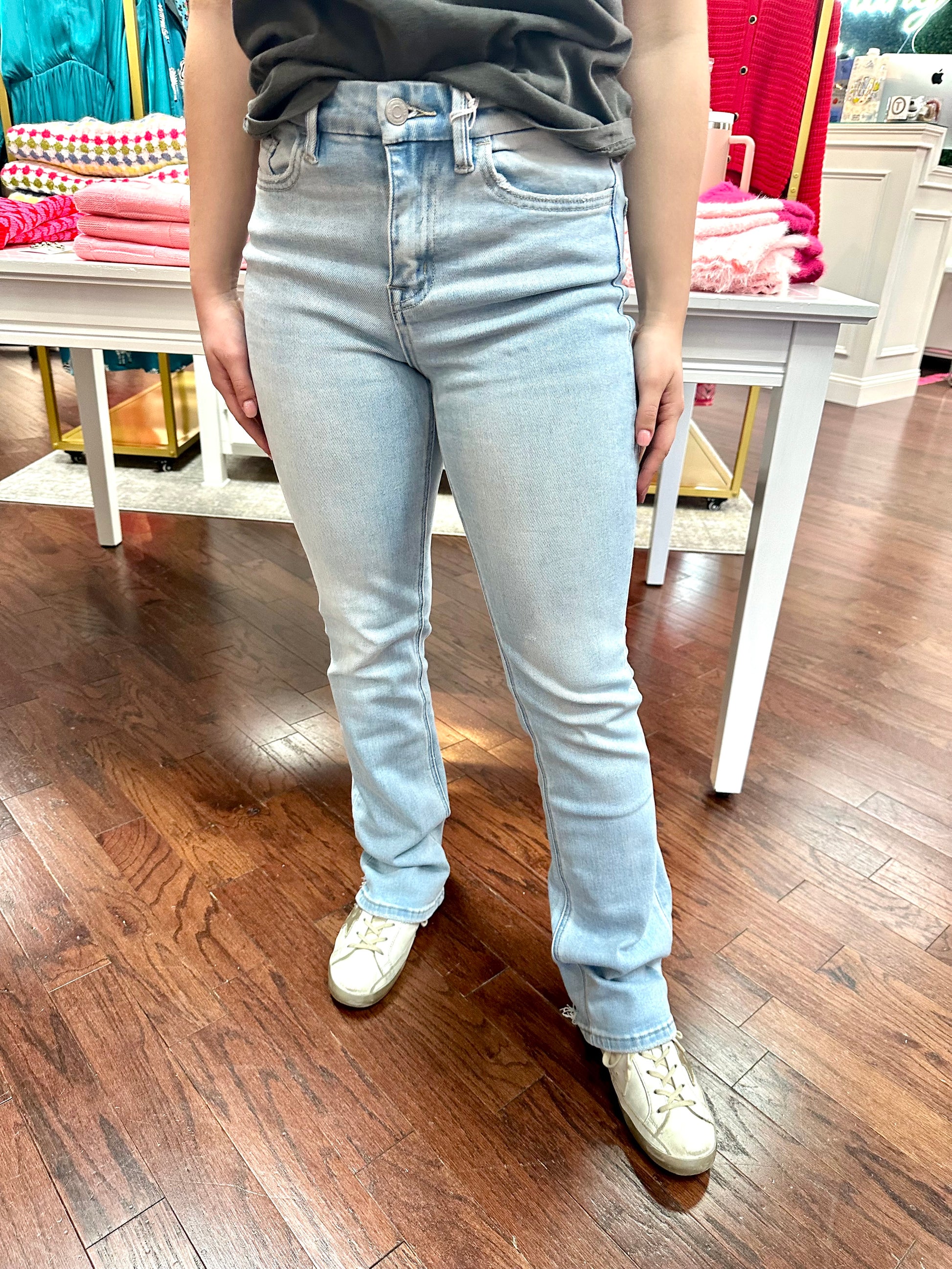 These bootcut jeans are a must-have for any fashion-forward individual. Made with comfort stretch denim, they offer all-day comfort while maintaining a sleek and stylish look. With a high rise waist and distressed hem, these full length jeans are perfect for any occasion. Rock this light wash pair and stay well-connected in the fashion world. 93% cotton, 5% polyester, and 2% spandex.
